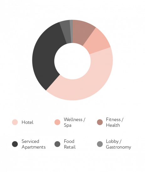 Die beeindruckende Gebäudehöhe schafft Raum für innovative Hospitality-Ideen. Ganze neun Etagen stehen für ein neues Hotel bereit. Direkt darüber befinden sich weitere neun Geschosse, die für Serviced Apartments vorgesehen sind. Im unteren Teil befinden sich die Lobby, Gastronomie, ein Begegnungszentrum und Flächen für Food-Retail-Konzepte. Ganz großartig wird es dann in den oberen vier Etagen, denn hier warten neben einer grandiosen Aussicht ein luxuriöses Spa, ein Fitnessstudio und diverse Health-Angebote.