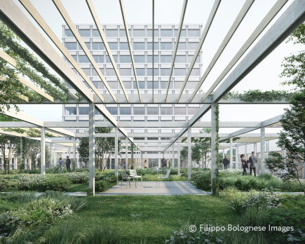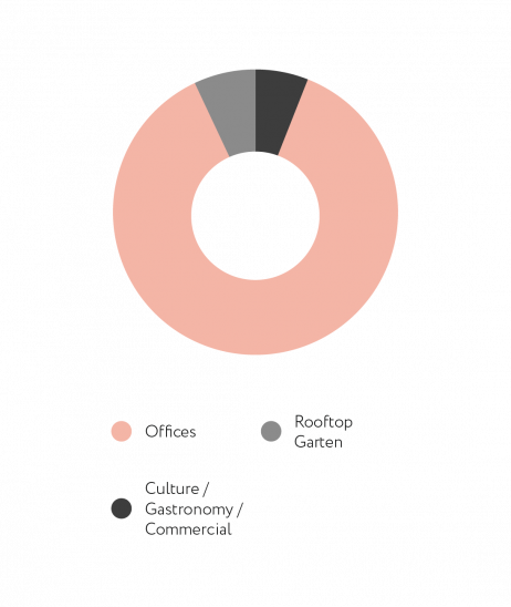 Der Dachgarten mit seinen 2.500 Quadratmetern wird als Erholungszone mit intensiv bepflanztem Garten entwickelt. Charmante Pergolen sorgen für Sonnen- und Witterungsschutz. Insektenhotels, Bienenstöcke und Urban Farming machen den Garten zum Treffpunkt für Mensch und Natur. Mit einem kleinen Barbetrieb kann zudem eine Gastronutzung angeboten werden.