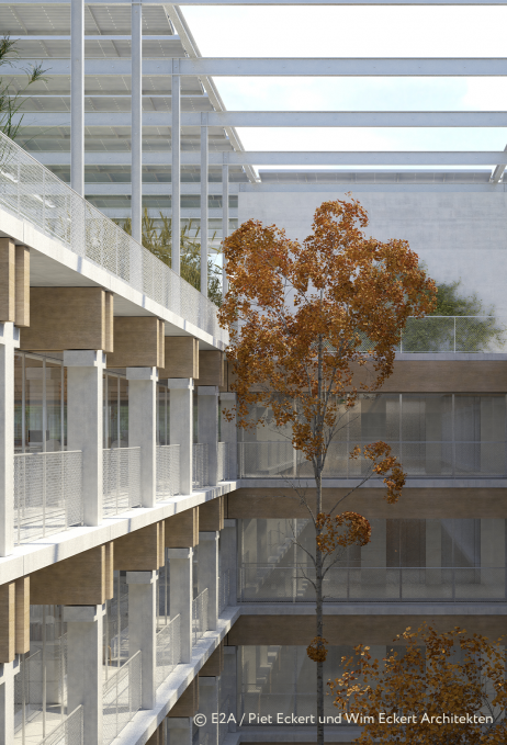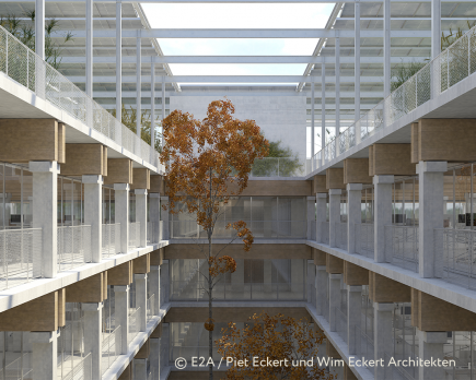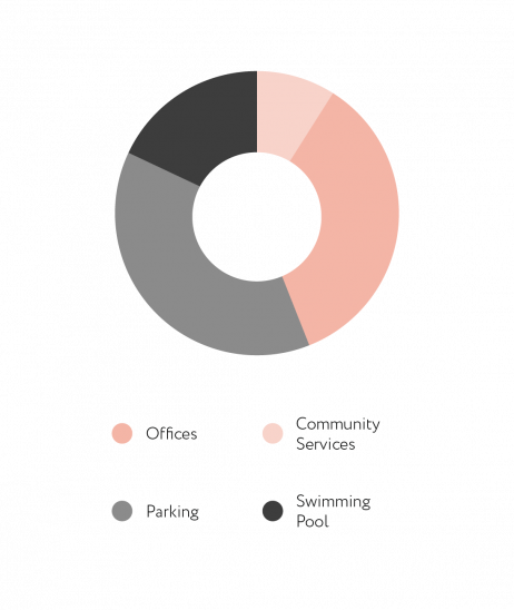 Der Nutzungsmix dieses Gebäudes wird bestimmt durch hochmoderne Parkmöglichkeiten und hochflexible Büroflächen. Im Erdgeschoss sind diverse Quartiersservices geplant, z. B. eine Fahrradwerkstatt, ein Pick-up-Store oder die Drop-off-Zone für ankommende Taxis. Im Dach wartet das öffentlich zugängliche Schwimmbad, das dieses Gebäude durch seine spektakuläre Weitsicht zu einem Magneten des gesamten Quartiers machen wird.
