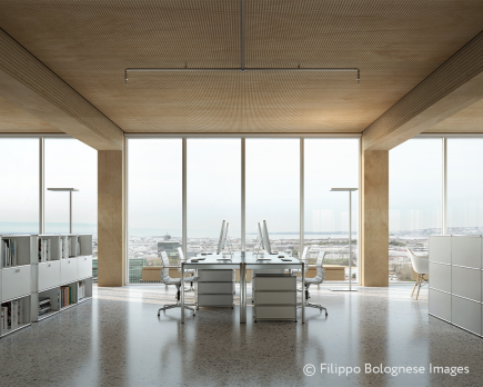 Die Geschosse 2 bis 7 ermöglichen flexible Raumkonzepte für Büros, die ganz nach den Wünschen konzipiert werden können. Im Erdgeschoss warten ein Café, ein Bikeport, aber auch Flächen für kulturelle Einrichtungen wie etwa ein Theater. So folgt auch dieses Gebäude der Idee von in.grid und verbindet ganz natürlich Lebens- und Arbeitswelten.