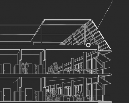 Die Dachsilhouette fügt sich durch ihre Traufkante von 21,50 Metern in den Straßenkorridor ein und bildet im größeren Zusammenhang eine identitätsstiftende Silhouette im Stadtmosaik.
