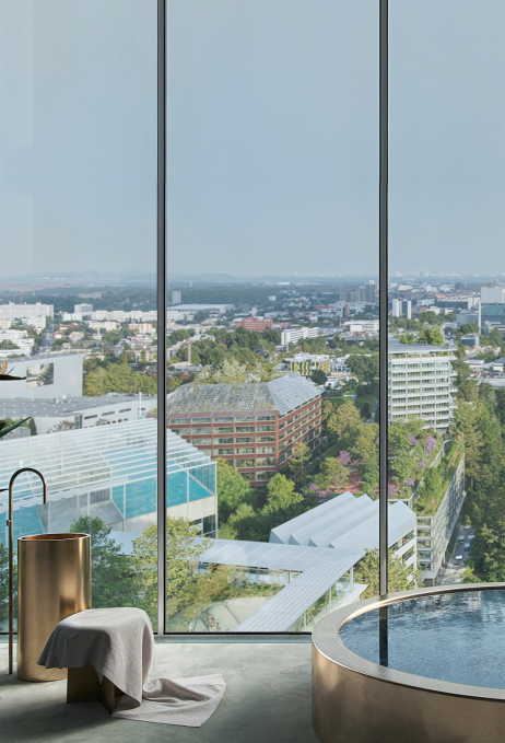 Die beeindruckende Gebäudehöhe schafft Raum für innovative Hospitality-Ideen. Ganze neun Etagen stehen für ein neues Hotel bereit. Direkt darüber befinden sich weitere neun Geschosse, die für Serviced Apartments vorgesehen sind. Im unteren Teil befinden sich die Lobby, Gastronomie, ein Begegnungszentrum und Flächen für Food-Retail-Konzepte. Ganz großartig wird es dann in den oberen vier Etagen, denn hier warten neben einer grandiosen Aussicht ein luxuriöses Spa, ein Fitnessstudio und diverse Health-Angebote.