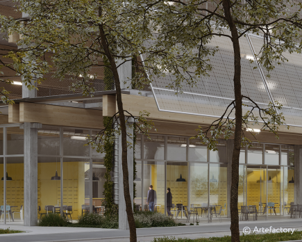 The cube-like shape and transparent façade construction determine the character of this building. Its permeable appearance is also emphasised by the photovoltaic and translucent polycarbonate elements on the top floor. Like in all in.grid buildings, a state-of-the-art timber hybrid construction is used here too.