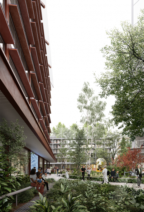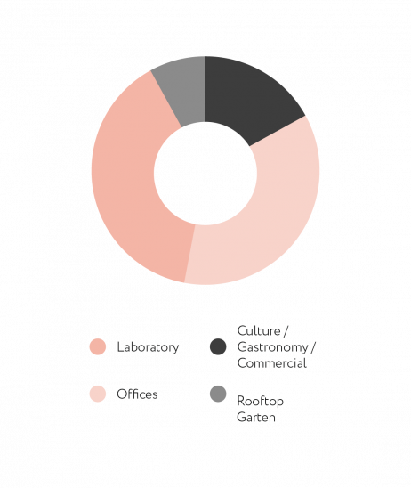 Lab meets office. The building’s modular design makes it possible to fulfil every tenant’s wish without the need for major renovation work. Its central surface areas can, for example, accommodate different lab layouts and be combined with evaluation stations on the façade. All of this is complemented on the ground floor by a wide range of cultural, retail, and food & beverage units. The lush rooftop garden is the perfect place for the diverse mix of tenants to get together and enjoy time out from their busy day.