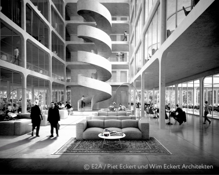 Right upon entering, it’s clear that great things are happening here. The open atrium with its striking spiral staircase not only joins the different floors but can also be used as an impressive meeting place. A 3.6-metre laboratory structural grid is being planned for the entire building – just one example of the state-of-the-art technology being used. For example, the façades and sloping roof of the leafy rooftop garden are fitted with high-performance photovoltaic modules.