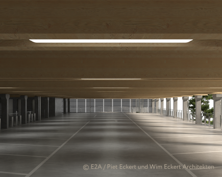 An innovative car park concept is being built on the first six upper floors. It has the potential to be reused and repurposed if required and boasts a support-free roof construction covering parking bays and driving lanes.